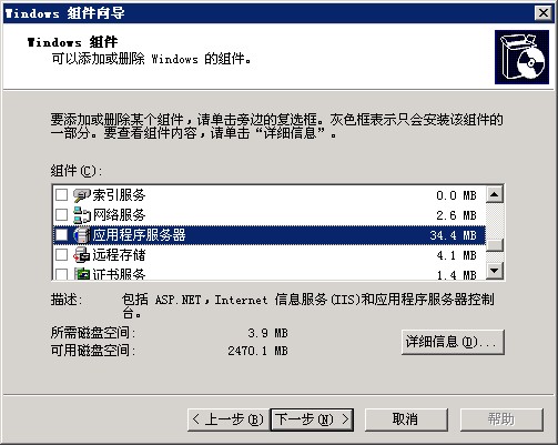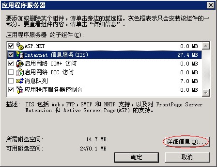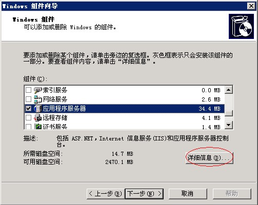 3、按照刚才的操作步骤,重新进入“添加/删除windows组件”,将“应用程序服务器”打钩,并点击右下角“详细信息”,如图:
