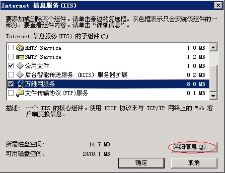 4、在“详细信息”中,勾选“ASP.NET”,并选择“Internet信息服务(IIS)”,点击右下角的“详细信息”,如图: