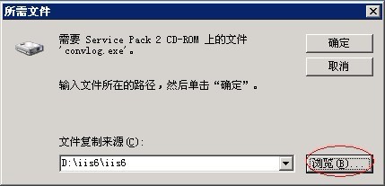 7、安装时提示“需要Serveice Pack 2 CD-ROM 上的文件 'convlog.exe'”,点“浏览”指向到您的IIS6组件包的目录,目录中会显示文件“Convlog.ex_”,然后按“确定”。提示需要其他文件时,也按此操作,若您勾选了以上说明以外的组件,可能因为组件包中未包含,导致安装失败。如图: